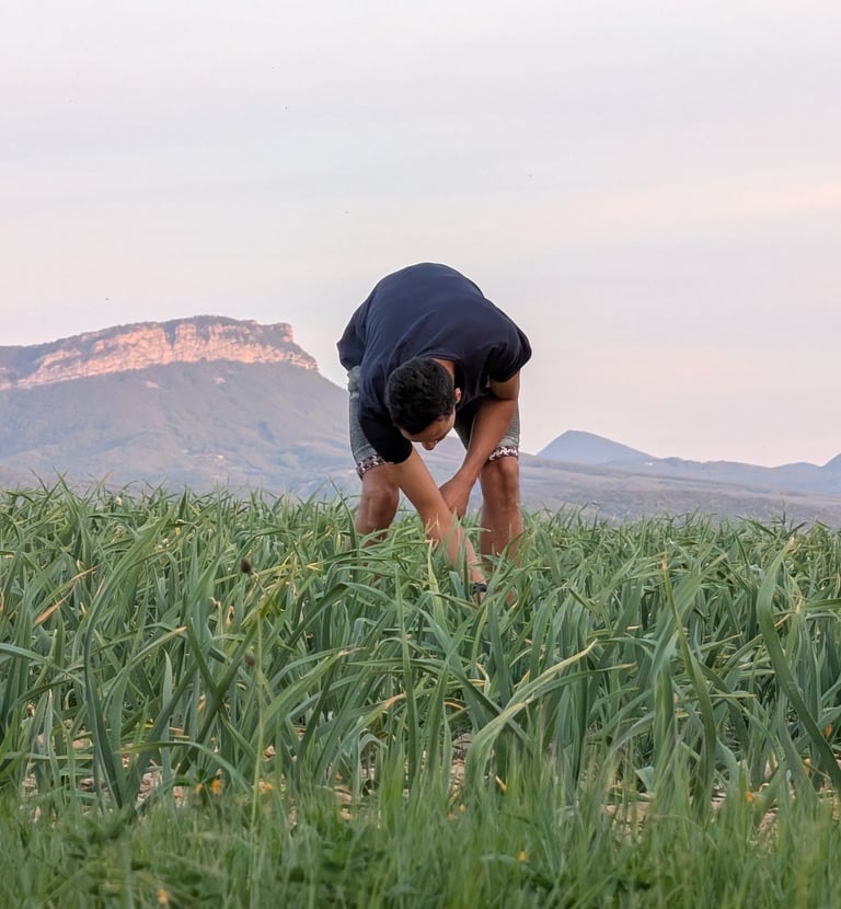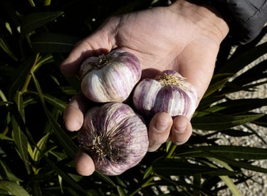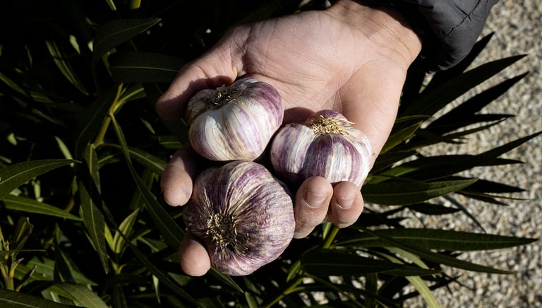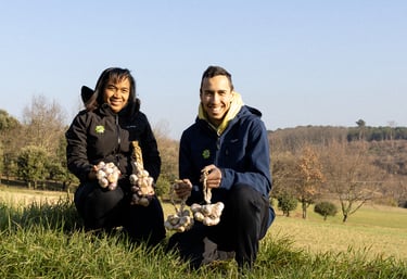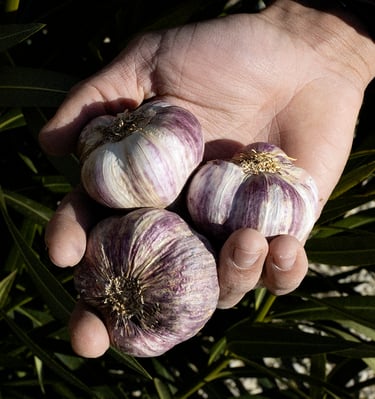 L'ail en botte, l'ail en tresse, ainsi que l'ail violet et blanc, font partie d'une tradition familiale qui se transmet de génération en génération. Depuis quatre générations, notre famille cultive l'ail avec passion. Il y a quelques années, nous avons également introduit l'ail noir, au goût unique !