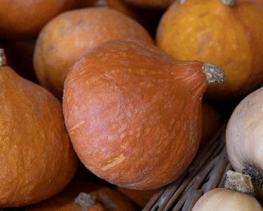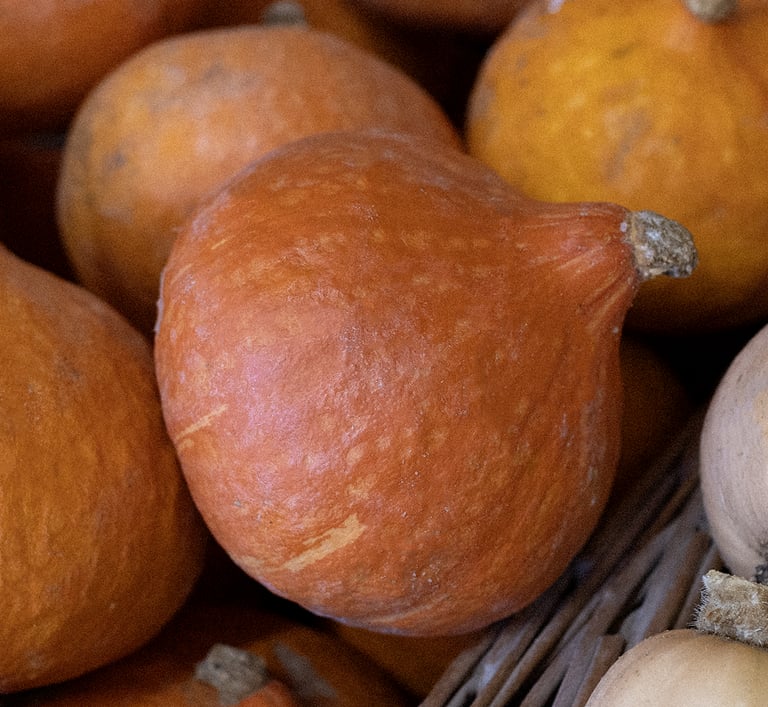 Plusieurs variétés de courges, disponibles de septembre à avril : potimarron, butternut, potiron, longue de Nice et spaghetti.