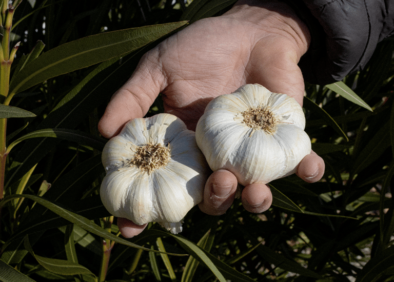 Les tresses d'ail violet, soigneusement réalisées par Marie, sont disponibles de juin à septembre.